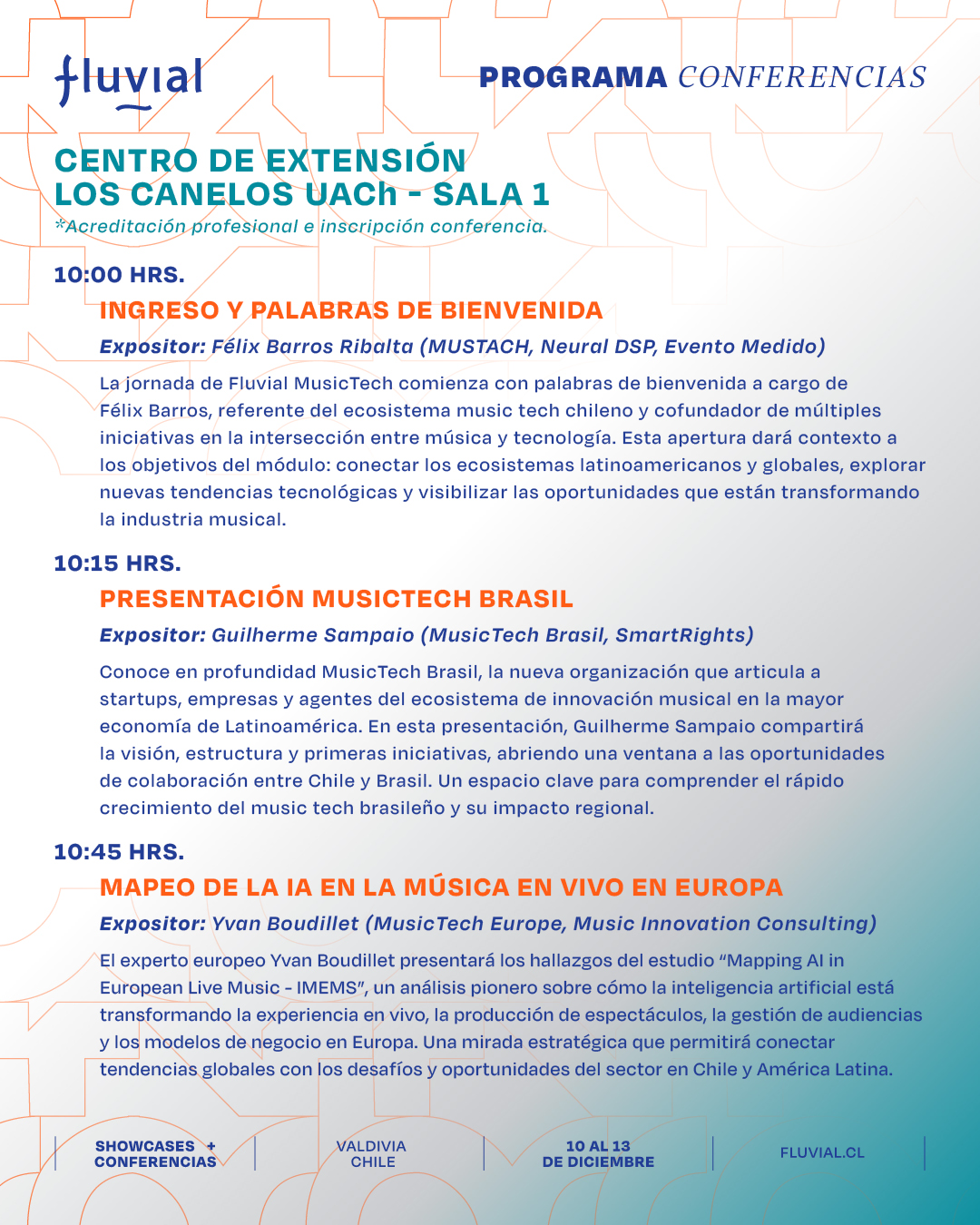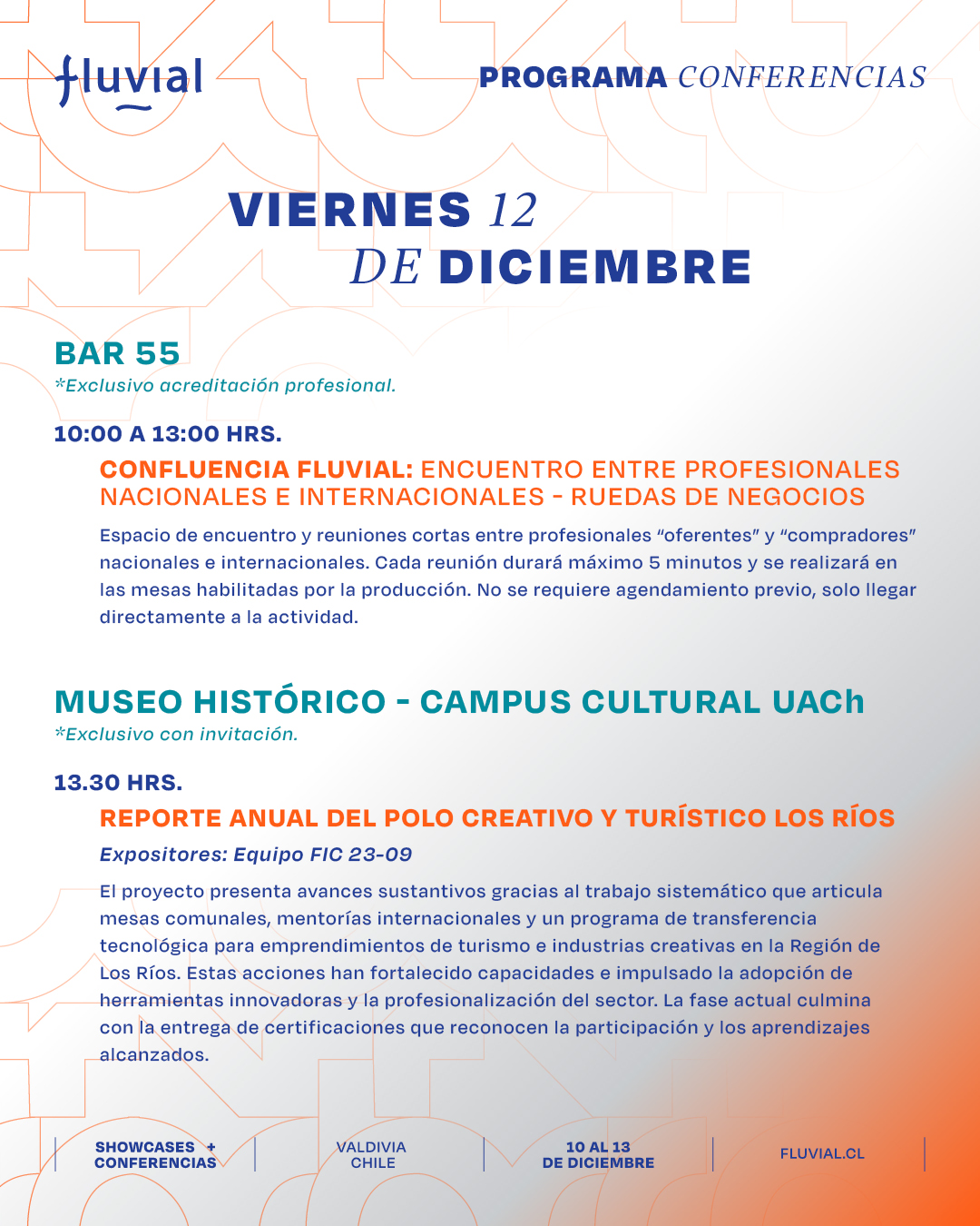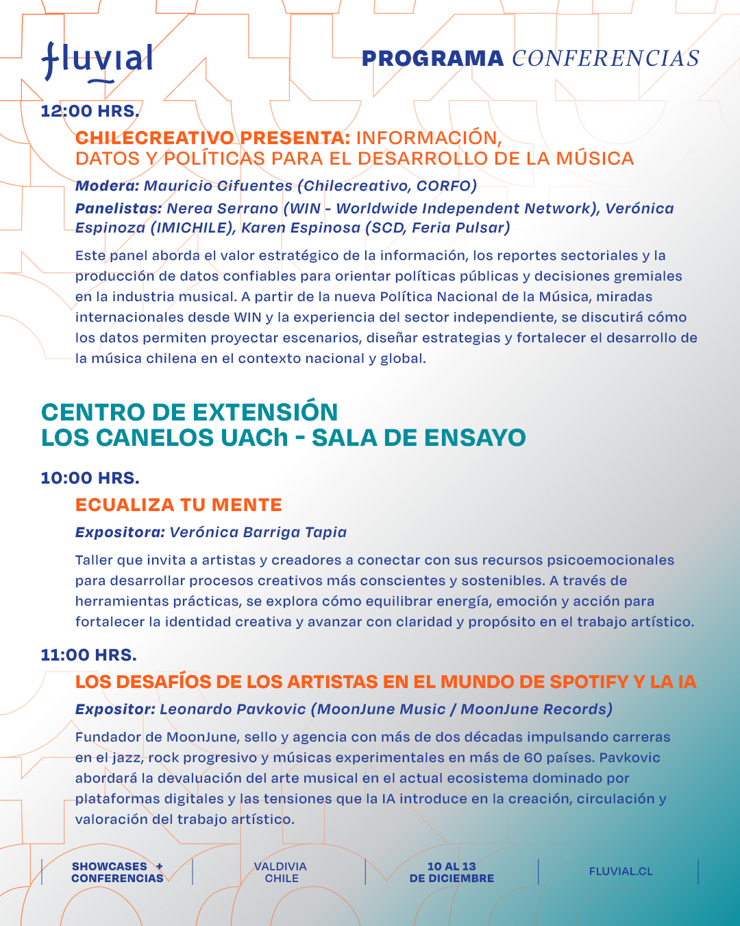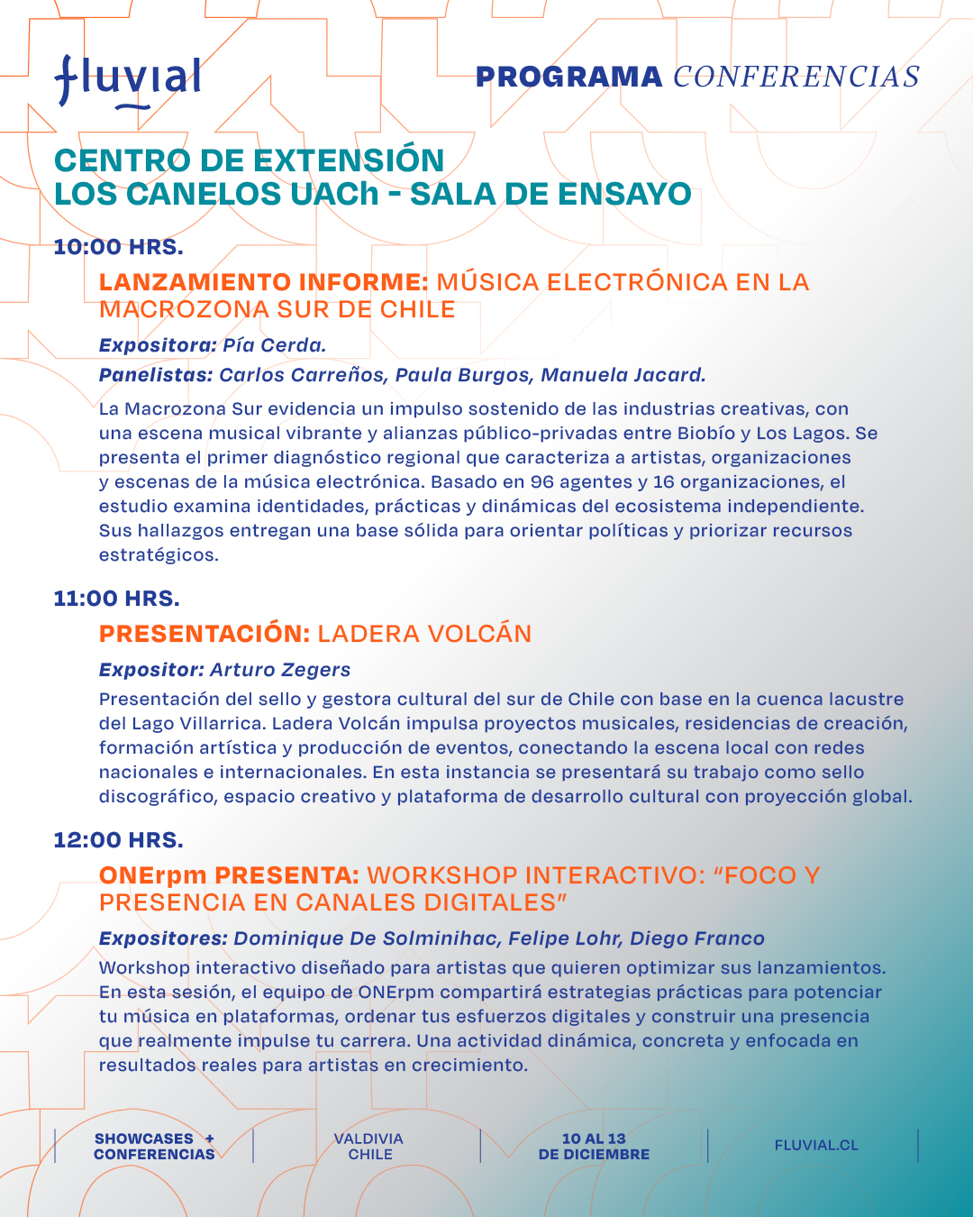 Te presentamos el programa de las actividades formativas, charlas, paneles y mesas de trabajo de Fluvial para que puedas organizar tus tiempos y participar en las actividades que más te interesen.